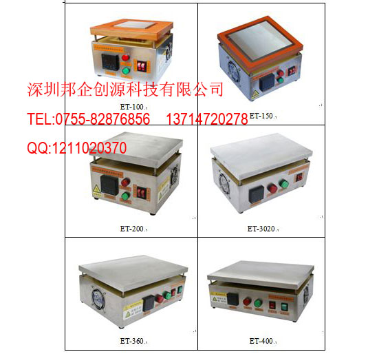 ET-100:加热板尺寸:100x100x20mm 功率400W 外形尺寸:200Lx200Wx150Hmm,净重:3.5Kg
